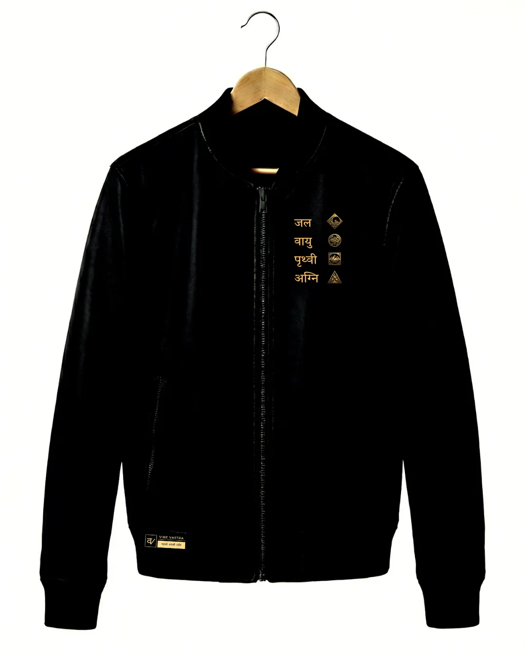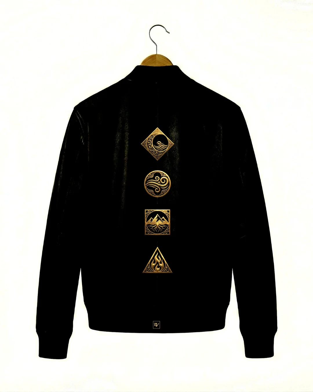 A modern black bomber jacket representing the five cosmic elements: earth, water, fire, air, and space. Minimalistic, meaningful, and stylish for contemporary cultural fashion.